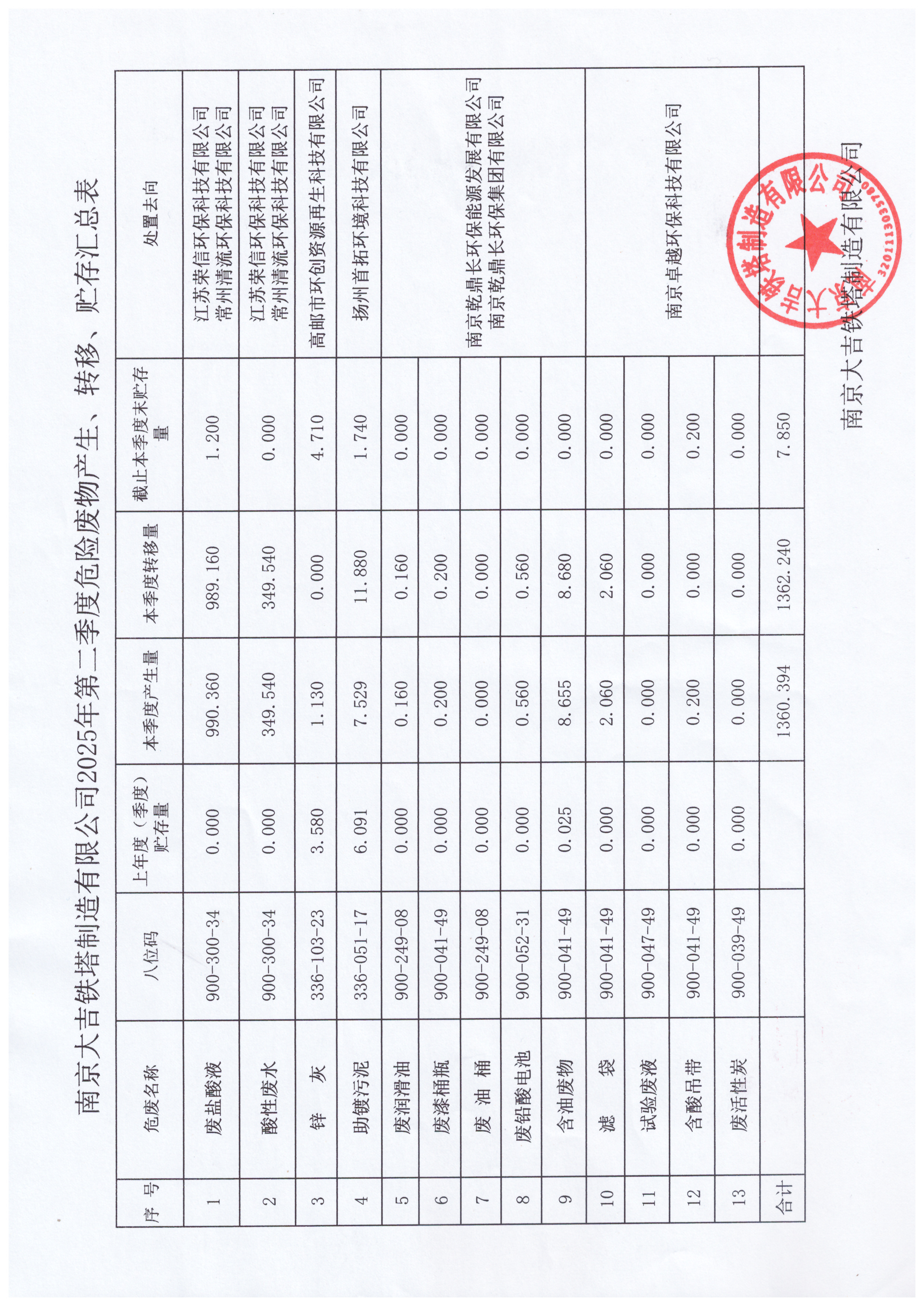 南京大吉铁塔制造有限公司2025年第二季度危险废物产生、转移、贮存汇总表